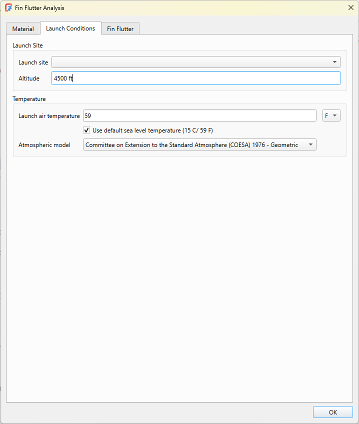 There are a number of factors that can affect fin flutter primarily atmospheric. Many such as humidity are not factored in because the most relevant value is the humidity at altitude, not at the launch site. The altitude of the launch site is important when converting from Above Ground Level (AGL) to Above Sea Level (ASL) values as the ASL value is used for atmospheric calculations while most flyers are thinking AGL. For convenience, a number of launch sites are included in a combobox to set the launch site altitude, or it can be set manually. This list is taken from the Altus Metrum launch site list with values added for the altitude.