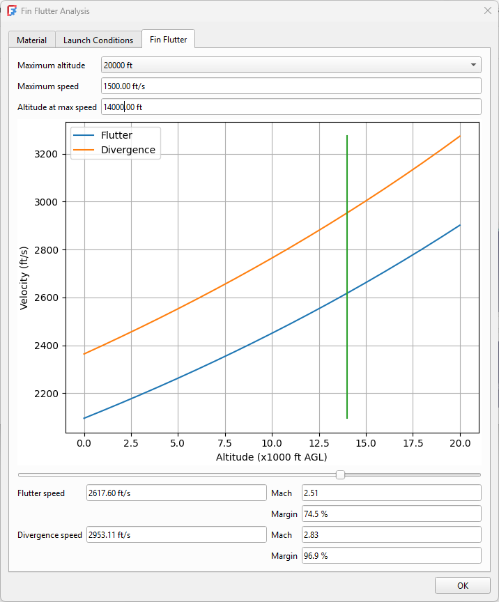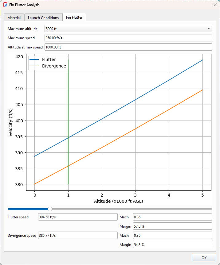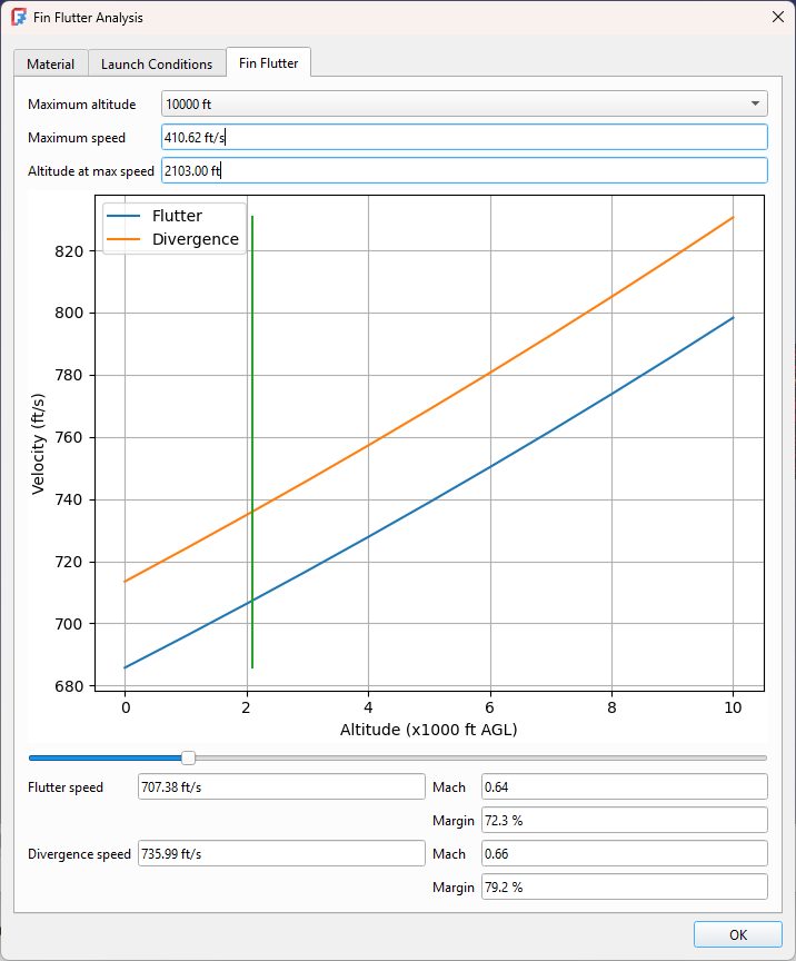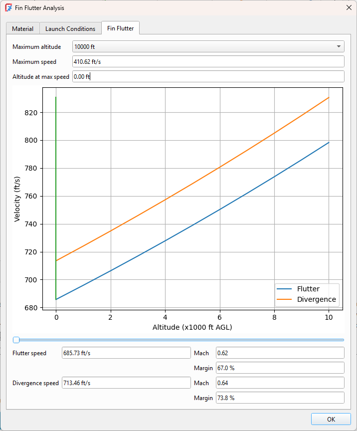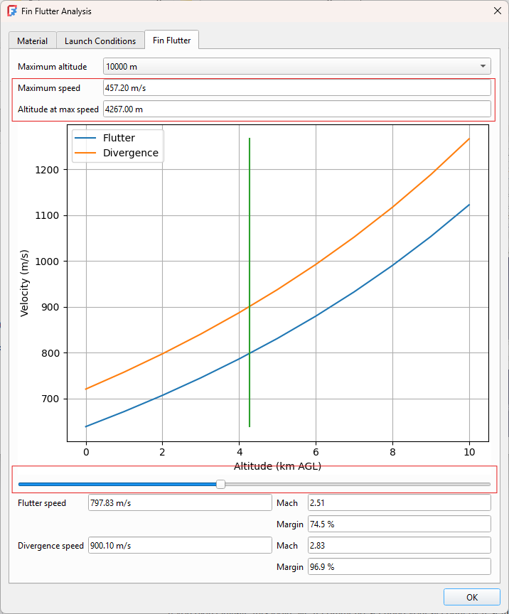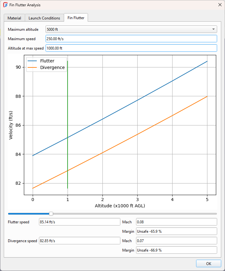 We can see we have a good safety margin at maximum altitude, but this is not where we achieve maximum speed. We could go to the simulation graphs to determine where the maximum speed was achieved, but an easier way is to use the slider to adjust the altitude and examine the results over the entire range. Even setting the altitude to 0 where the flutter speed is the lowest shows we have significant safety margin. This rocket is ready to fly!