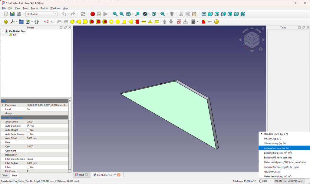 The fin was created manually using the Rocket Workbench’s fin tool. The nice thing about FreeCAD is that even though all dimensions are metric internally, the user can specify their preferred units. Since the document describes the dimensions in inches, we use the same here.