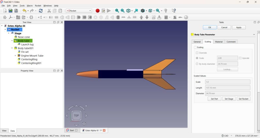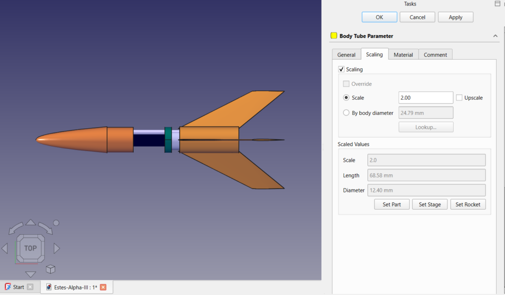 Again some caution is warranted here. Only the external components are scaled, and not all of them. Launch lugs, rail guides, and similar are not adjusted. A scaled version of a 1/8″ launch lug that was appropriate for the original Alpha III is not appropriate for a 4″ high powered version. You’ll want to use a rail button or similar. Internal components such as motor mounts and centering rings are not adjusted, although there are some auto settings that may adjust some values. An 18mm C motor is probably not going to be able to launch the larger rocket. Materials aren’t changed. Your cardboard centering ring may now need to be made of plywood. There is still work to do, but a lot of it is now simplified.