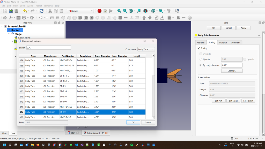We use this to our advantage when scaling the whole rocket instead of a single component. In the example above, we’ve selected the LOC BT-3.9 body tube for our upscaled Alpha III. We can then apply that to the whole rocket by selecting “Set Rocket”. It then scales all remaining external components to the same scale as our body tube. In this case, it adjust the dimensions of the parts and resets the scale values to 1.